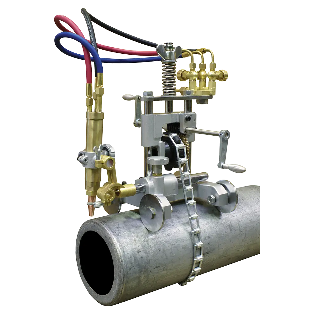 The Gas Pipe Cutting Machine is a hand-crank machine operated by a portable oxy-fuel pipe. It uses a chain and gear drive system to cut around pipes.